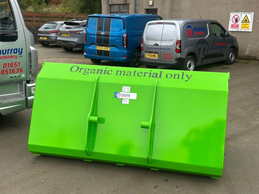 8’, 3.3 cub.m Grain Bucket with curved sides and Manitou brackets and finished in Merlo green. This one has bespoke stencilling on the top as requested.